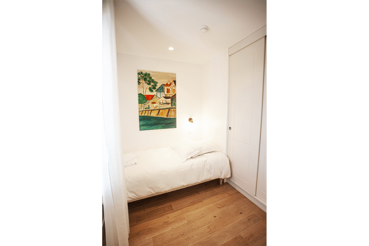 T4 composé d’un balconnet avec vue sur le bassin d’Arcachon et grand balcon comprenant un coin cuisine équipé, une première chambre avec un lit simple, une seconde chambre avec un lit double et une troisième chambre avec 2 lits simples, un canapé convertible dans le séjour, une salle de douche à l’italienne avec sèche serviettes et des toilettes séparés. Climatisation réversible et parking privé.